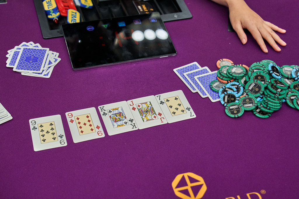 Chaque joueur reçoit sept cartes au total, dont quatre sont visibles et trois cachées. Les joueurs doivent sélectionner cinq cartes pour former leur main.